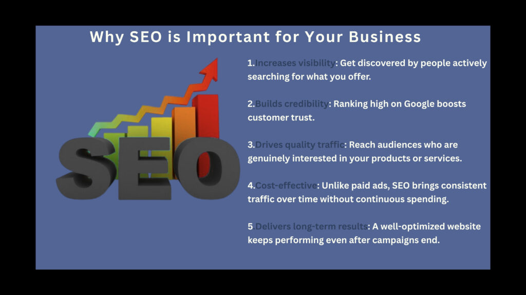 SEO helps your website rank higher on search engines like Google, making it easier for people to find your business when they search for products or services related to yours.